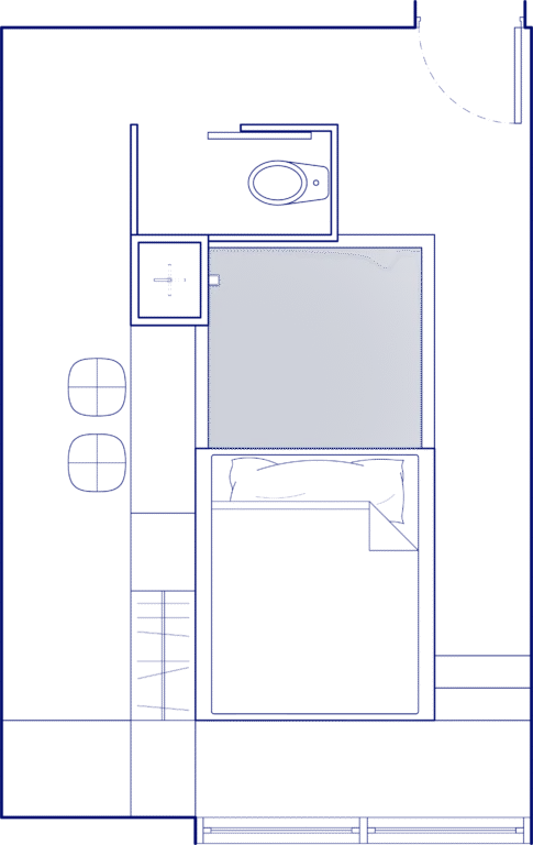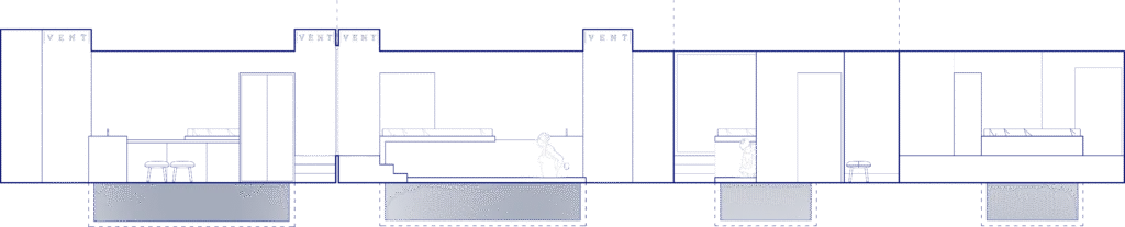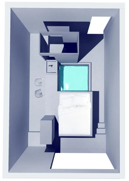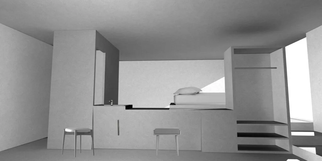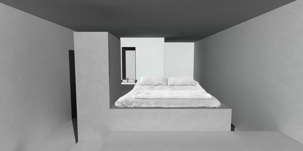 This short-term living space is based on the conceptual placement of a fountain at its center. The water from the source collects in the central reservoir, which serves as the core element, around which the other essential functions of the space are organized. The reservoir is 80 cm deep, aligning with the height of the bed, which appears to float freely above the water’s surface. The autonomy of the ruin, centered around the fountain, evokes an instinctive human presence.