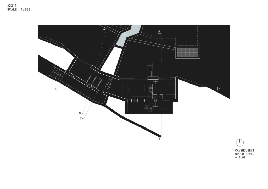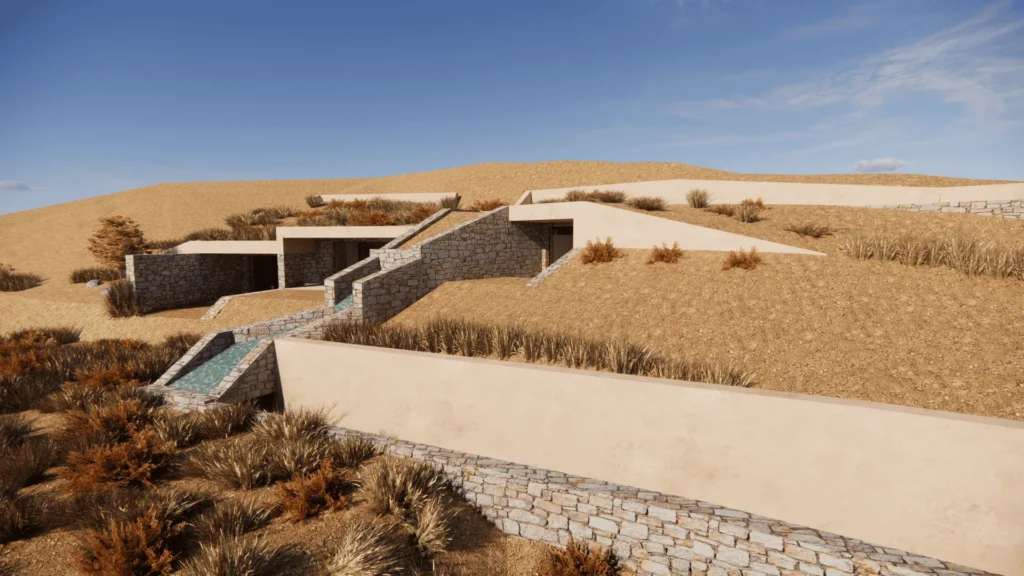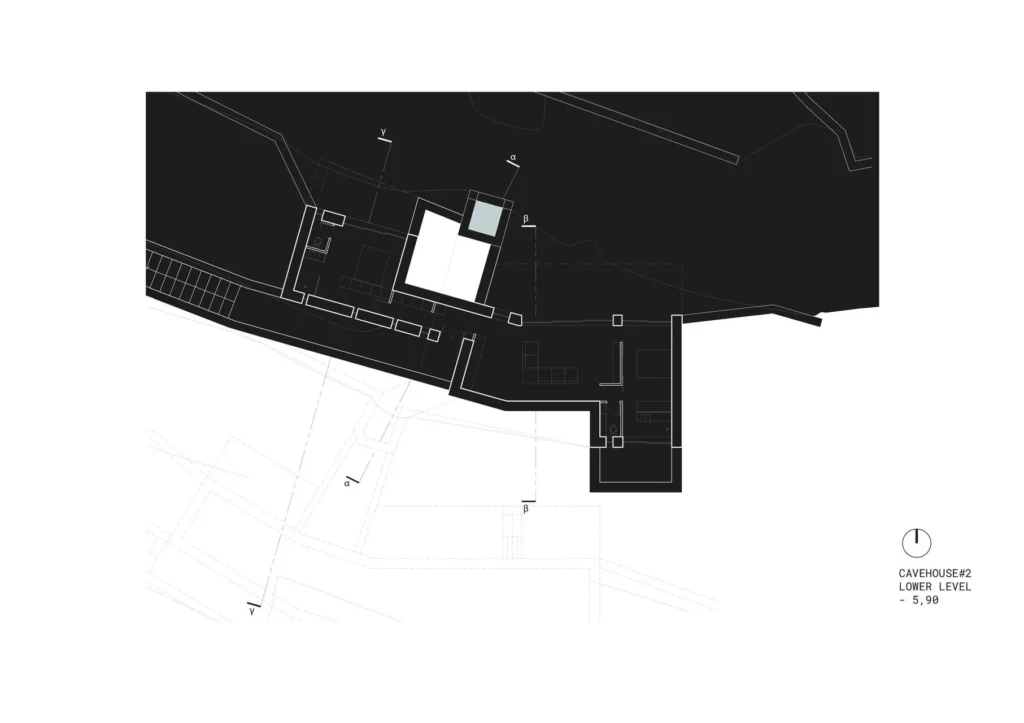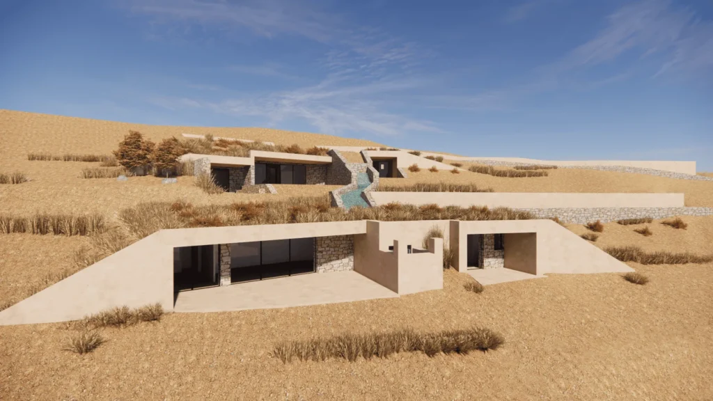 The semi-subterranean buildings comprise two independent residences with a total usable area of 200m², situated in an area of exceptional natural beauty on the island of Paros.