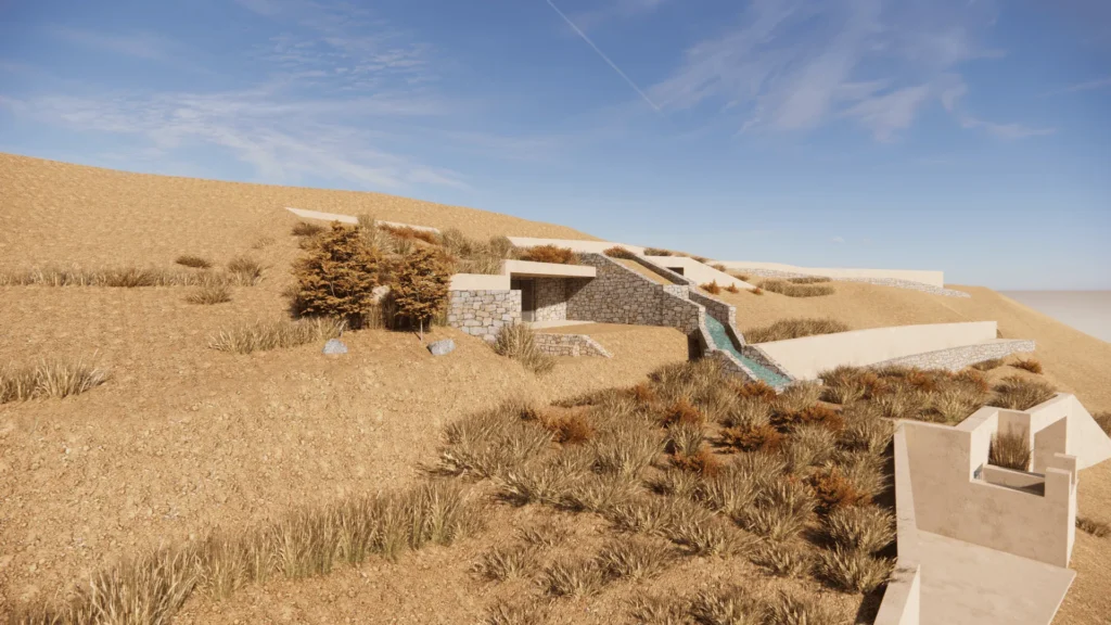 An effort was made to preserve and highlight the spring and cistern as imprints of the past. A linear water path begins at the spring and leads to the preserved cistern, forming a vertical water feature that connects the two residences.
