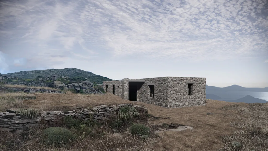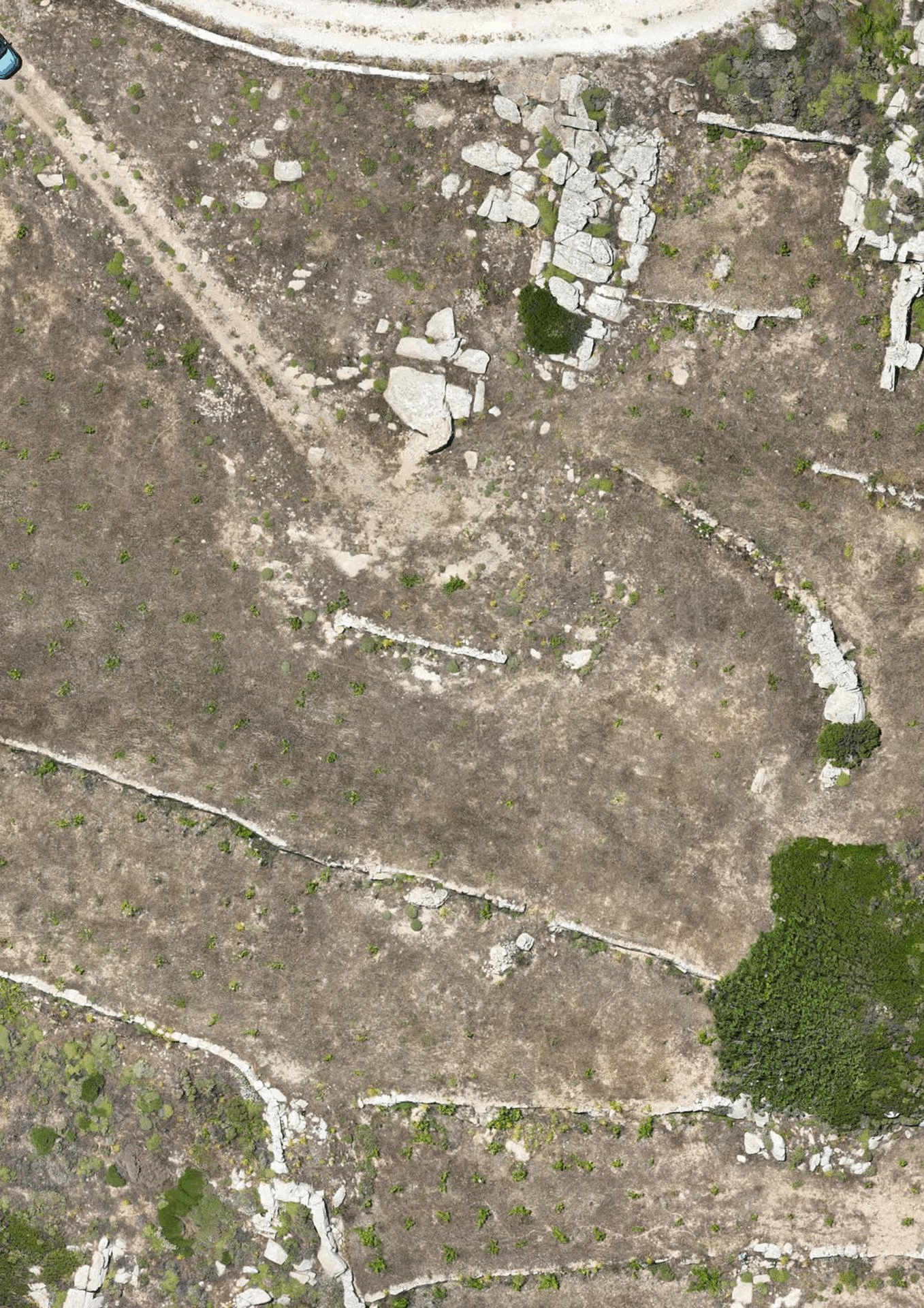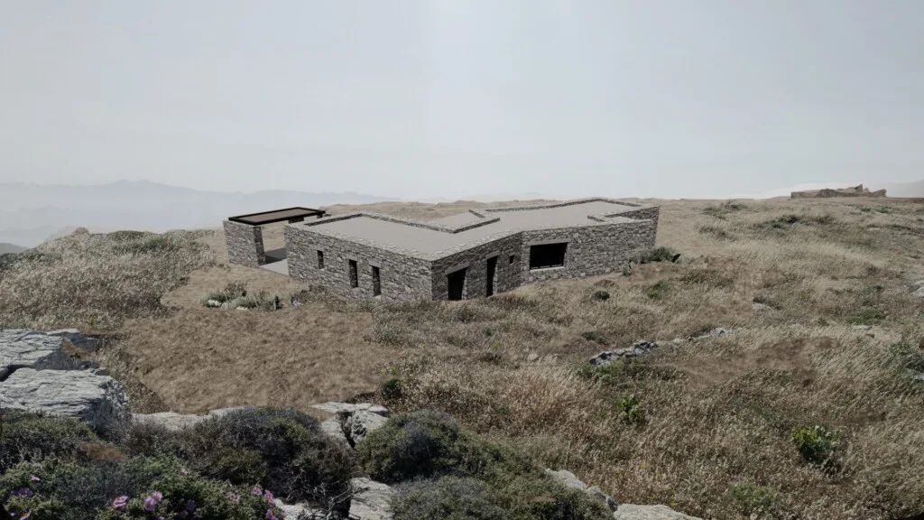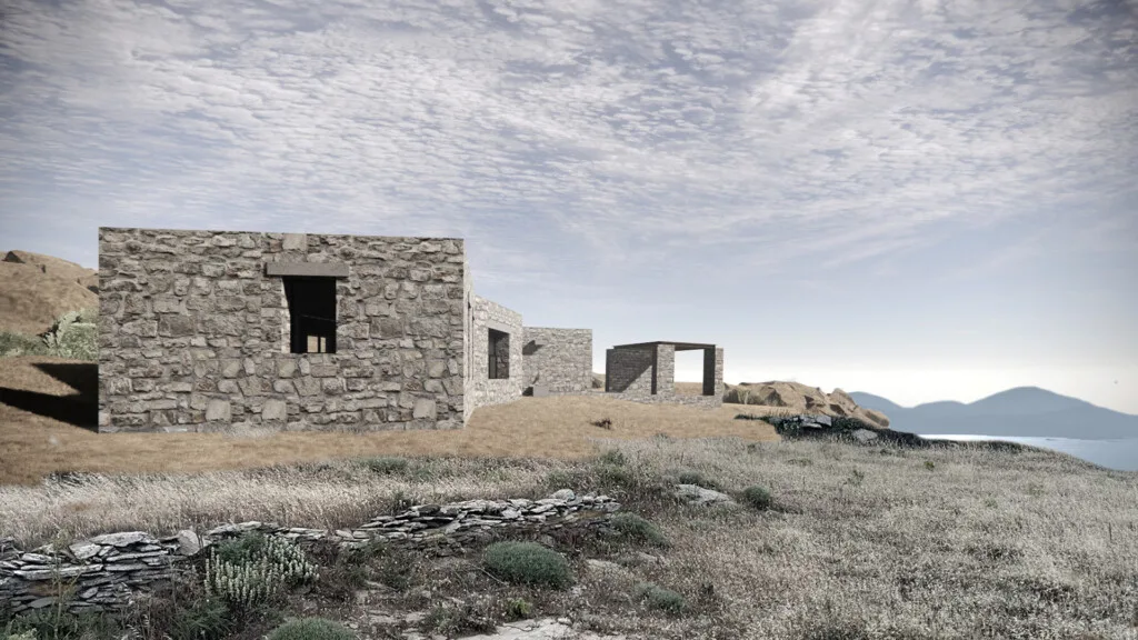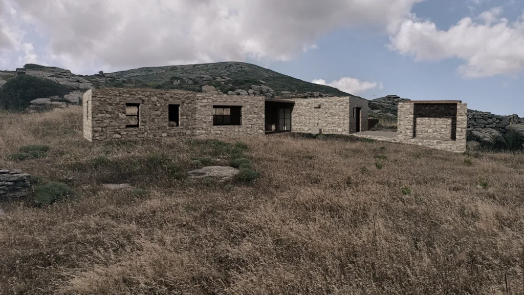 The plot is situated on a hill and the fertile part of it was once used as a vineyard. The view over the eastern part of the plot is open and unobstructed to the sea and the island complex. The landscape is varied along the northwestern and southwestern axis and is characterised by masses of scattered rocks and dry stones, which are significant in this area.