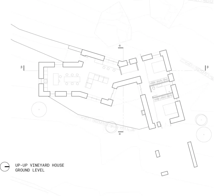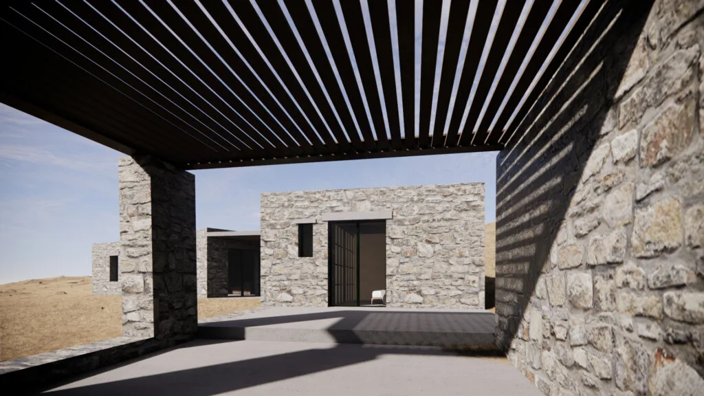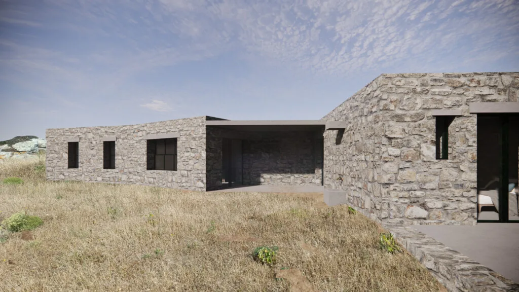 The Up-Up architectural study analyses the design concept of a ground floor stone-built house. The net surface of the house is 100 m². The floor plan of the resident is a typical ‘L’ shape. In the middle of the floor plan, one can see a semi-open space (surface area of 17 m²) which creates two independent wings in the house. The two wings are connected by a longitudinal corridor – gallery. The south entrance of the house leads to the kitchen, dining room, living room and W.C. The corridor -gallery- following the entrance leads to the north -private- wing of the residence where there are 2 bedrooms with shared bathroom and laundry room.