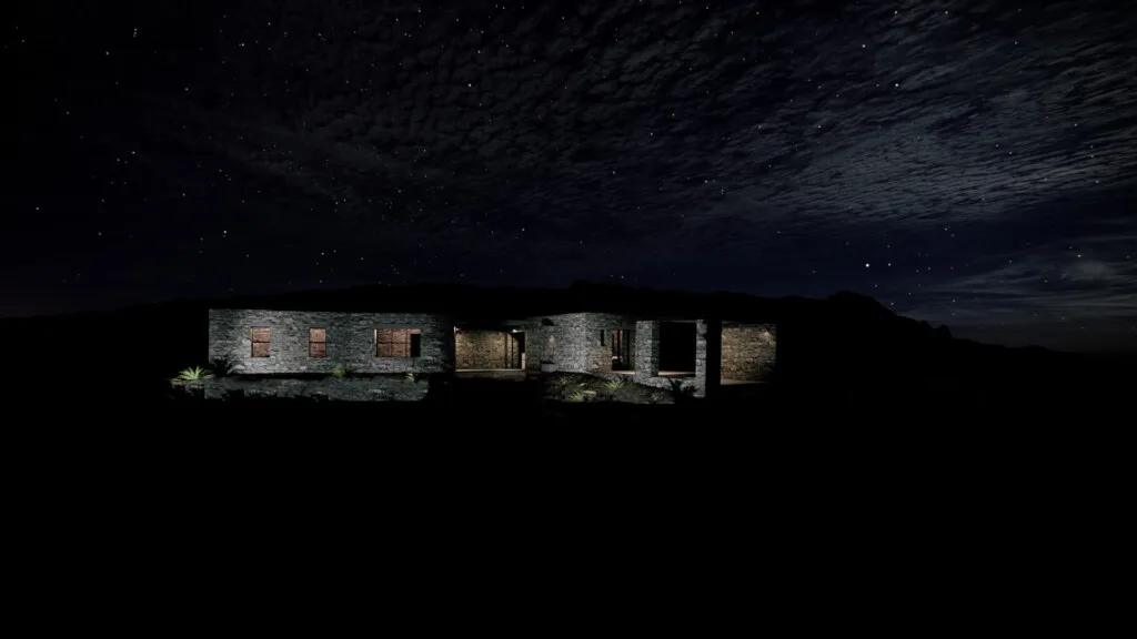 It was decided to place the house in close proximity to the rocks, which allows interaction with them. The typology of the floor plan is L- shaped with an internal patio, protected by the (mainly north) strong